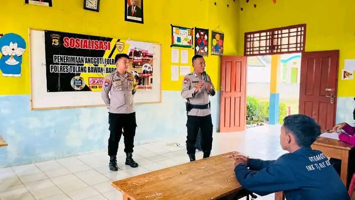 Bripka Harianto juga melakukan sosialisasi penerimaan anggota Polri Tahun 2023 kepada anak didik SMK Taruna Jaya,